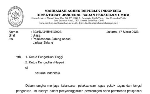 Jakarta –INDOTIPIKOR.COM-MEDIA FORSIMEMA RI—– Direktorat Jenderal Badan Peradilan Umum (Ditjen Badilum) mengeluarkan surat bernomor 823/DJU/HK/III/2026 tentang pelaksanaan sidang sesuai jadwal sidang. Surat tersebut ditujukan kepada seluruh Pengadilan Tinggi dan Pengadilan Negeri di Indonesia.