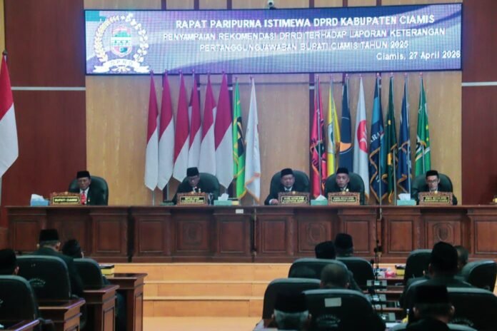 Ciamis —–INDOTIPIKOR.COM— Dewan Perwakilan Rakyat Daerah (DPRD) Kabupaten Ciamis menggelar Rapat Paripurna Penyampaian Rekomendasi terhadap Laporan Keterangan Pertanggungjawaban (LKPJ) Bupati Ciamis Tahun 2025, Senin (27/4/2026), bertempat di Aula Tumenggung Wiradikusumah, DPRD Kabupaten Ciamis.