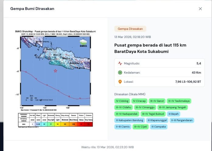 JAKARTA–INDOTIPIKOR.COM-MEDIA LOYALIS BMKG RI—Hari Jumat 13 Maret 2026 pukul 02.18.20 WIB wilayah Laut Selatan Sukabumi, Jawa Barat diguncang gempa tektonik. Hasil analisis BMKG menunjukkan gempabumi ini memiliki parameter update dengan magnitudo M5,3. Episenter gempabumi terletak pada koordinat 8,04° LS ; 106,86° BT, atau tepatnya berlokasi di laut pada jarak 121 Km tenggara Kabupaten Sukabumi, Jawa Barat pada kedalaman 53 km.