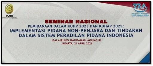 Ikatan Hakim Indonesia (IKAHI) memperingati HUT ke-73 dengan menggelar seminar nasional bertema “Pemidanaan dalam KUHP 2023 dan KUHAP 2025: Implementasi pidana non-penjara dan tindakan dalam sistem peradilan pidana Indonesia”. Acara berlangsung secara hybrid di Balairung Mahkamah Agung, Jakarta, Selasa (21/04/26).