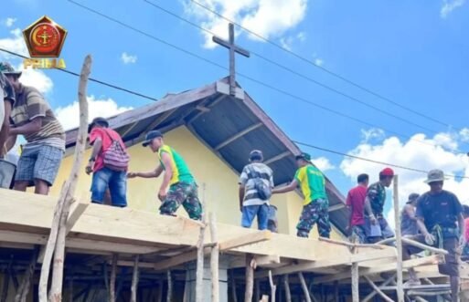 INDOTIPIKOR.COM-MEDIA LOYALIS TNI—Prajurit TNI dari Satgas Pamtas RI-RDTL Sektor Barat Yonarhanud 2 Kostrad Pos Haumeniana bergotong royong pengecoran dalam rangka melanjutkan pembangunan Gereja Kapela Haumeniana bersama masyarakat Desa Haumeniana, Kec. Bikomi Nilulat, Kab. TTU, Rabu (05/11)