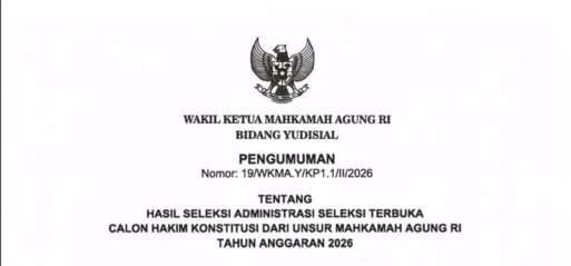 Jakarta ––INDOTIPIKOR.COM-MEDIA LOYALIS MAHKAMAH AGUNG RI—Wakil Ketua Mahkamah Agung (MA) Bidang Yudisial secara resmi mengumumkan hasil seleksi administrasi Seleksi Terbuka Calon Hakim Konstitusi dari Unsur MA Tahun Anggaran 2026.