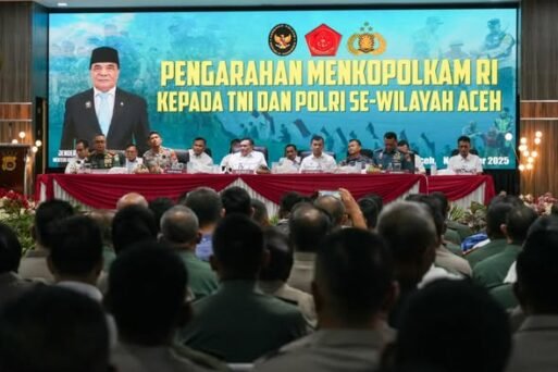 “Saya ingin menyampaikan pesan dari Bapak Presiden kepada kita semua. Beliau menyampaikan rasa terima kasih kepada para prajurit dan para pemerintah daerah yang ada di Banda Aceh ini, karena sudah melaksanakan tugas sampai saat ini. Beliau melihat pelaksanaan tugas di sini sangat membanggakan,” ujar Menko Polkam Djamari Chaniago saat memberikan pengarahan kepada aparat TNI, Polri dan Pemerintah Daerah di Banda Aceh, Rabu (26/11/2025).