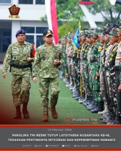 JAKARTA–INDOTIPIKOR.COM-MEDIA LOYALIS TNI—(Puspen TNI). Panglima TNI Jenderal TNI Agus Subiyanto didampingi Kepala Staf TNI Angkatan Darat Jenderal TNI Maruli Simanjuntak dan Kepala Staf TNI Angkatan Udara Marsekal TNI Mohamad Tonny Harjono, secara resmi menutup Latihan Integrasi Taruna Wreda (Latsitarda) Nusantara ke-46 Provinsi Aceh. Upacara penutupan berlangsung di Dermaga Mako Kolinlamil, Tanjung Priok, Sabtu (14/2/2026).