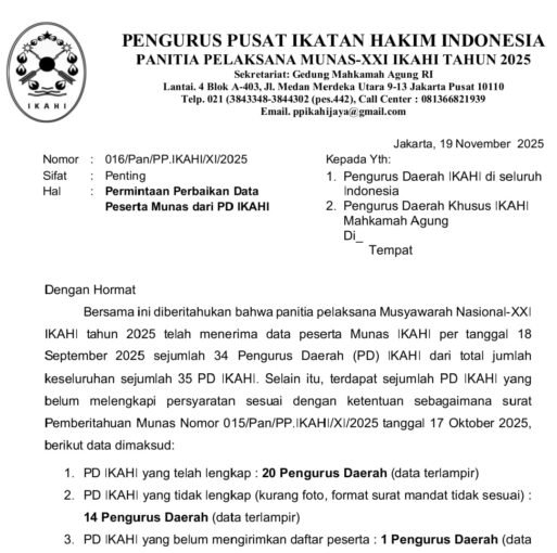 Jakarta –INDOTIPIKOR.COM-MEDIA FORSIMEMA RI—– Panitia Musyawarah Nasional (Munas) XXI Ikatan Hakim Indonesia (IKAHI) pada Rabu (19/11/2025) mengeluarkan pemberitahuan resmi kepada seluruh Pengurus Daerah (PD) IKAHI untuk segera melakukan perbaikan dan melengkapi data peserta Munas.