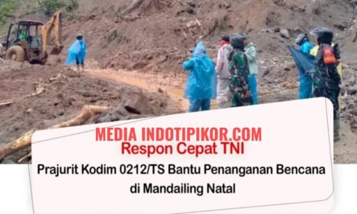 INDOTIPIKOR.COM-MEDIA LOYALIS TNI—(Puspen TNI). Komandan Kodim (Dandim) 0212/Tapanuli Selatan, Letkol Arm Delli Yudha Adi Nurcahyo, S.E., M.M., mengerahkan personel di jajarannya untuk membantu penanganan banjir dan tanah longsor yang melanda Kecamatan Panyabungan, Kabupaten Mandailing Natal, Kamis (27/11/2025). Prajurit diterjunkan untuk mengevakuasi warga terdampak, membersihkan material longsor, serta mengamankan akses vital, termasuk jembatan Hutaborgot yang terputus akibat derasnya arus sungai.