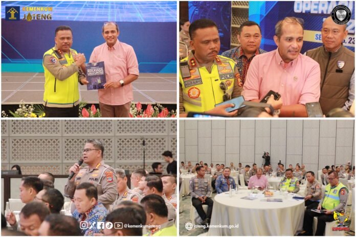 SEMARANG ––INDOTIPIKOR.COM—MEDIA LOYALIS KEMENTERIAN— Wakil Menteri Hukum Republik Indonesia, Prof. Dr. Edward Omar Sharif Hiariej, memberikan pengarahan hukum kepada jajaran Korps Lalu Lintas (Korlantas) Polri dalam kegiatan Analisa dan Evaluasi Operasi Ketupat Tahun Anggaran 2026 di Padma Hotel Semarang, Kamis (23/4).